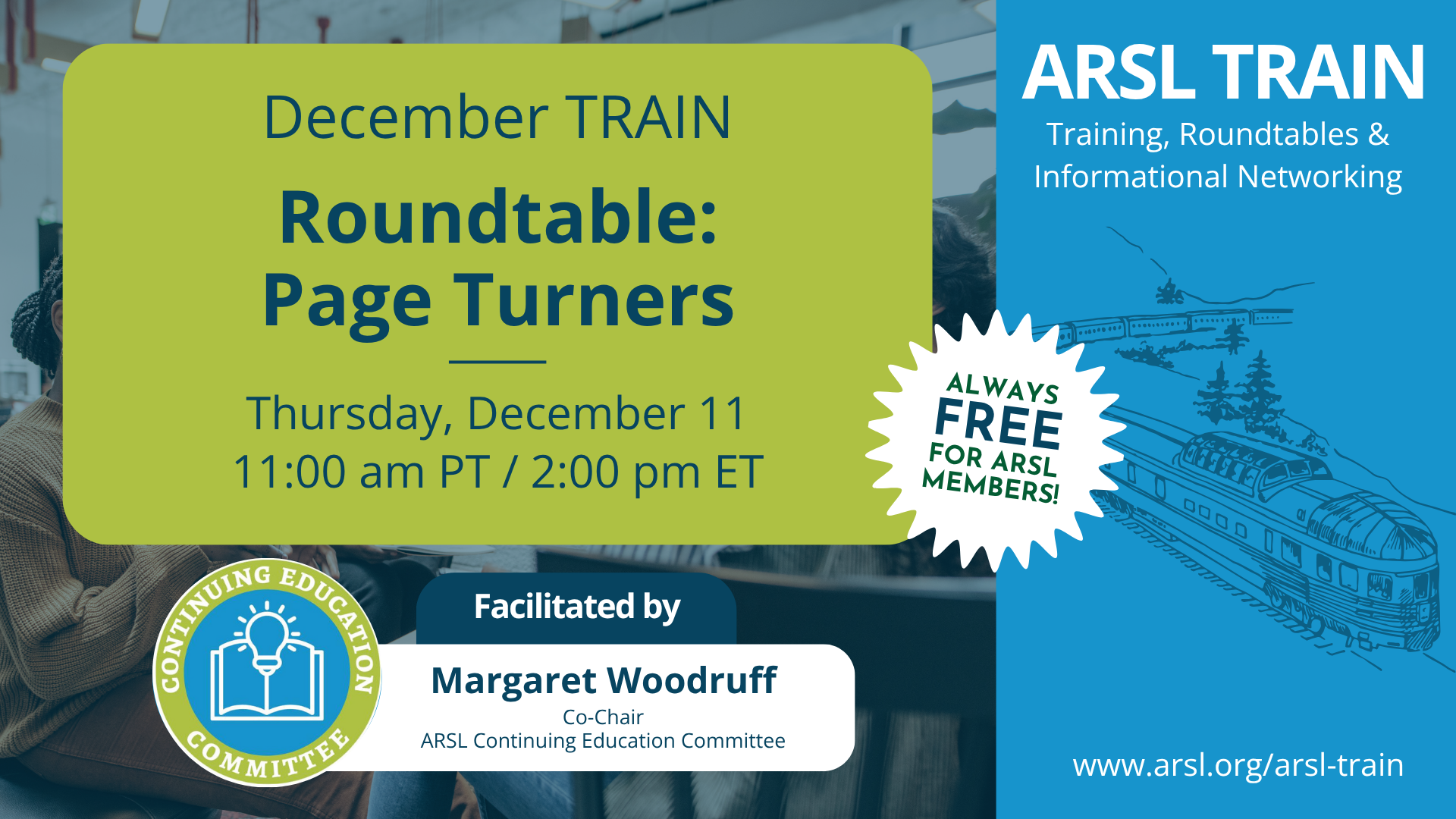 Join us for ARSL's TRAIN (Training, Roundtables, and Informational Networking) series! Each month, we offer an online workshop, roundtable, or networking event designed to support and connect library professionals.