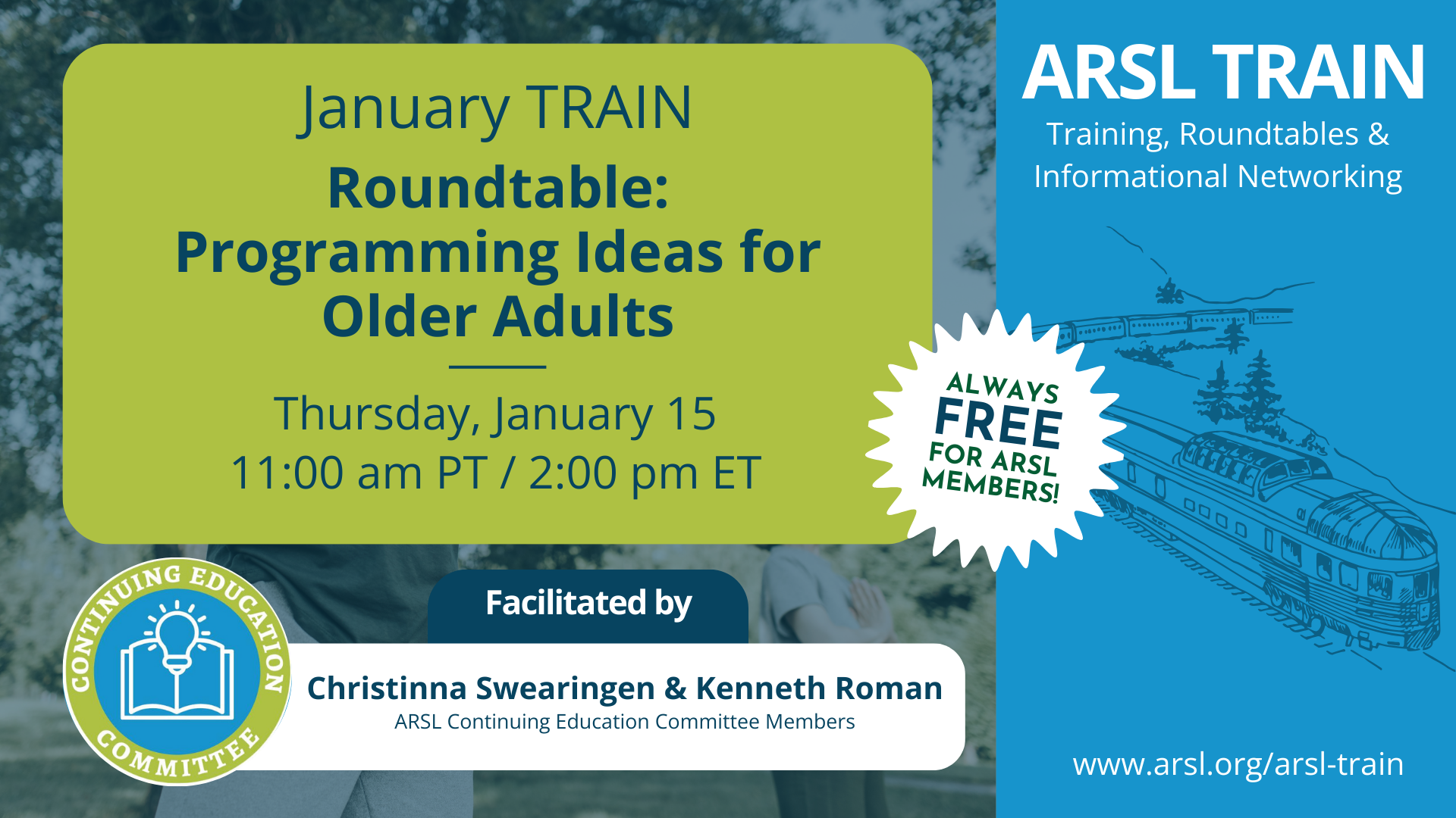 ARSL members, join us for a collaborative discussion on creative, engaging programming for older adults in your library! Share your successes, troubleshoot challenges, and gather fresh ideas from fellow library professionals serving rural and small communities.