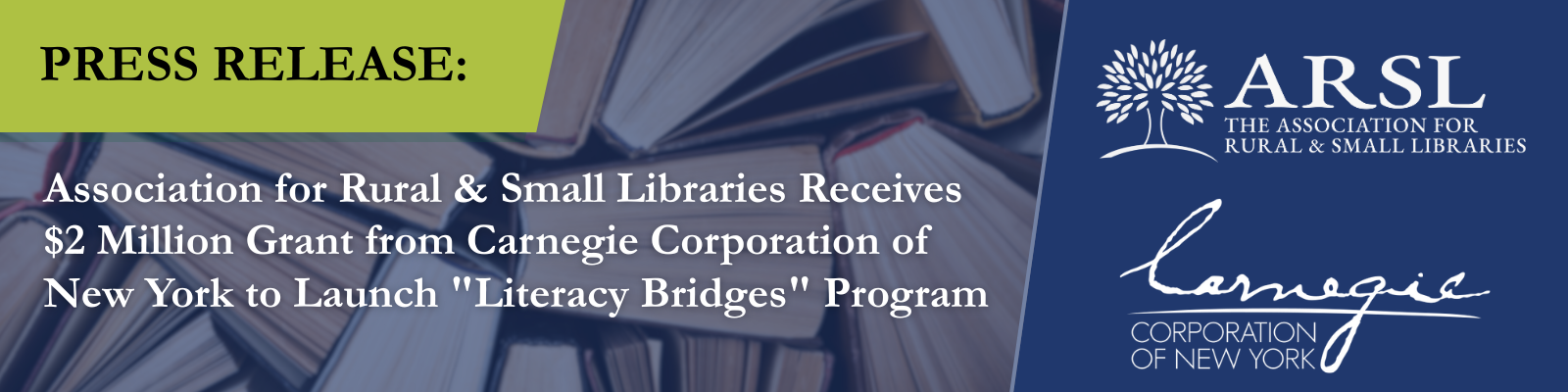 Seattle, WA – December 19, 2025 – The Association for Rural and Small Libraries (ARSL) today announced a $2 million, 2-year grant from Carnegie Corporation of New York for the "Literacy Bridges: Empowering 21st Century Communities" program. Through a competitive application process, selected Carnegie-built libraries serving small and rural communities will receive $25,000 grants and professional development to create locally tailored programs addressing adult digital and basic literacy needs. Awarded libraries will be able to craft and personalize their programs to meet their unique community needs. The grant will enable ARSL to build a robust infrastructure to provide professional development, ongoing guidance, and technical assistance to participating libraries throughout the program period. "The importance of the incredible commitment Carnegie Corporation of New York is making in pledging this level of funding toward small and rural libraries cannot be overstated," said Kate Laughlin, Executive Director of ARSL. "Basic and digital literacy competence contributes to improved health outcomes, increased community engagement, and greater ability for adults to support the future education of generations to come. By focusing on literacy and digital inclusion, libraries can empower adults to participate in society, thereby promoting a healthy democracy fully. This investment continues CCNY's legacy of transformative philanthropy by directly addressing a pressing need across our nation." “Through Literacy Bridges, we are supporting Carnegie-built libraries as they strengthen adults’ digital and literacy skills. These capabilities are essential to accessing information, participating in community life, and navigating today’s civic landscape,” said Ambika Kapur, program director for Education at For more information: CCNY Press ReleaseAbout the Association for Rural and Small Libraries: About Carnegie Corporation of New York: Media Contacts: Issued December 22, 2025 by the Association for Rural & Small Libraries (ARSL) |